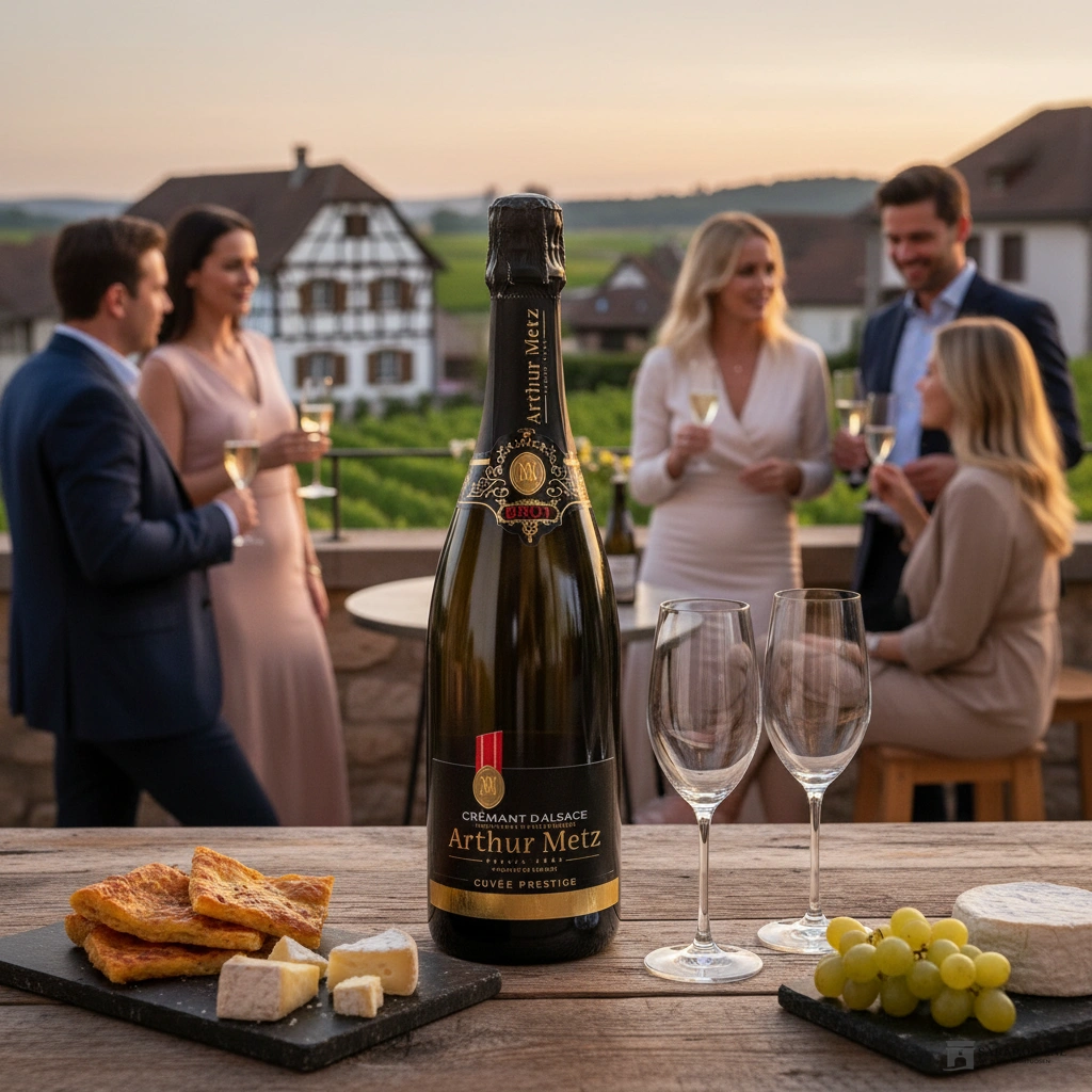 Genießen Sie die exquisite Handwerkskunst und die lebendige Tradition des Elsass mit jedem Glas des Arthur Metz Crémant d’Alsace Brut.