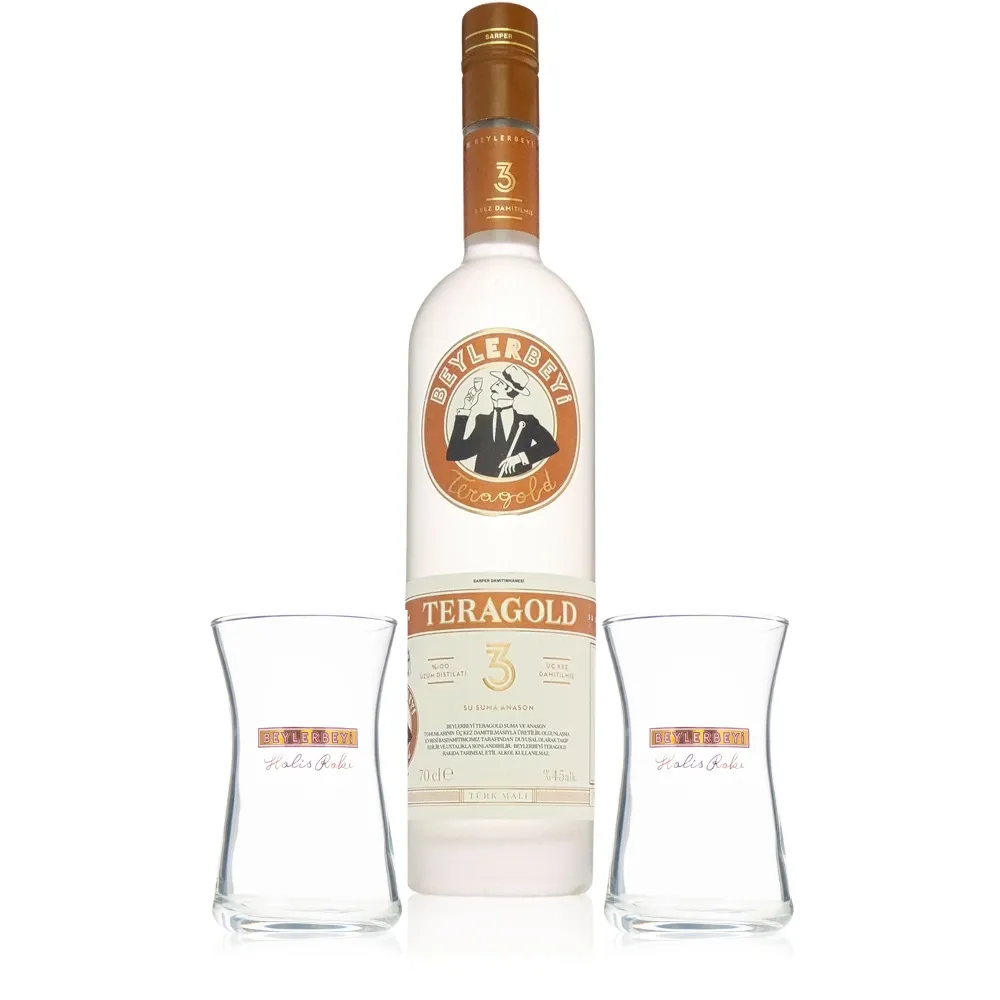 Erleben Sie den exquisiten Beylerbeyi Raki Teragold, präsentiert mit zwei eleganten Teragold Gläsern. Diese Gläser, ursprünglich für Tee konzipiert, sind perfekt dazu geeignet, das volle Aroma des Rakis zur Geltung zu bringen, was dieses Set zu einem besonderen Genusserlebnis macht.
