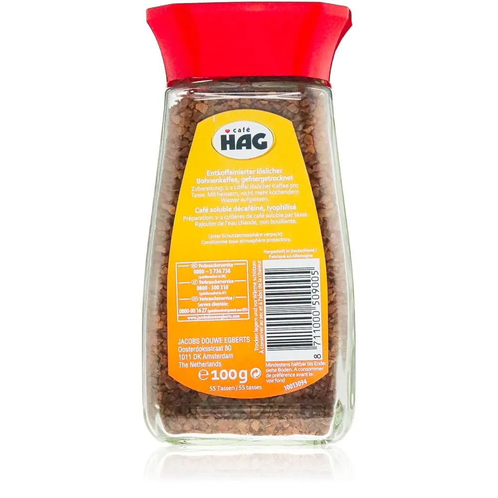 Cafe Hag hat es verstanden, löslichen Kaffee neu zu definieren: Schnell in der Zubereitung und dennoch voller Persönlichkeit. Ob am frühen Morgen oder als kleine Auszeit zwischendurch – dieser Kaffee bietet Ihnen stets einen stilvollen Begleiter für Ihre persönlichen Genussmomente. Die 100g Packung hält dabei genau das richtige Maß an Frische bereit und lässt Sie flexibel auf jede Lust auf Kaffee reagieren.