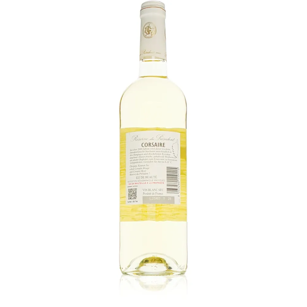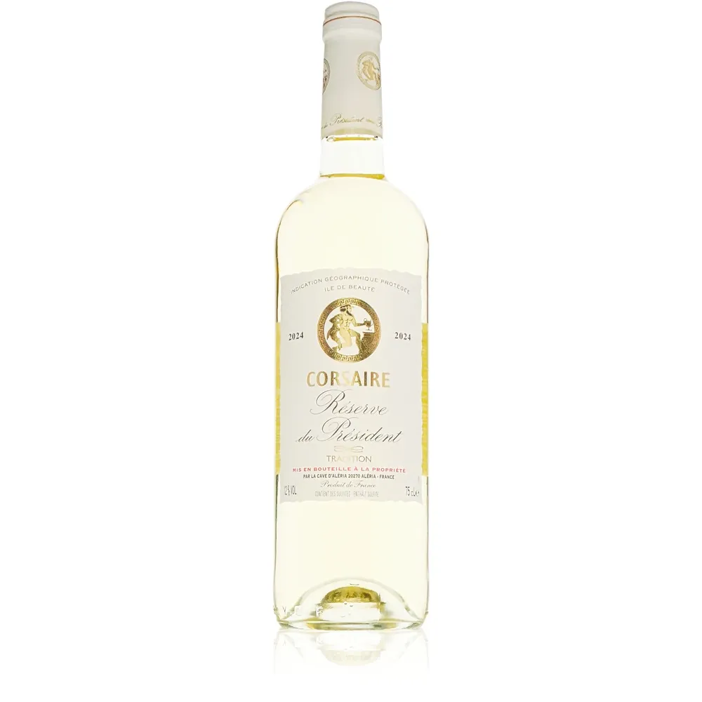 Wenn das Licht der Mittelmeersonne auf die sonnenverwöhnten Weinberge von Korsika trifft, entsteht Magie. Corsaire weiß ist weit mehr als ein Wein – er ist eine Einladung, mit jedem Schluck die Seele dieser faszinierenden Insel zu entdecken. Die Réserve du Président öffnet mit diesem Cuvée aus Chardonnay und Vermentino ein Fenster zu einer Welt voller Leichtigkeit und französischer Raffinesse.