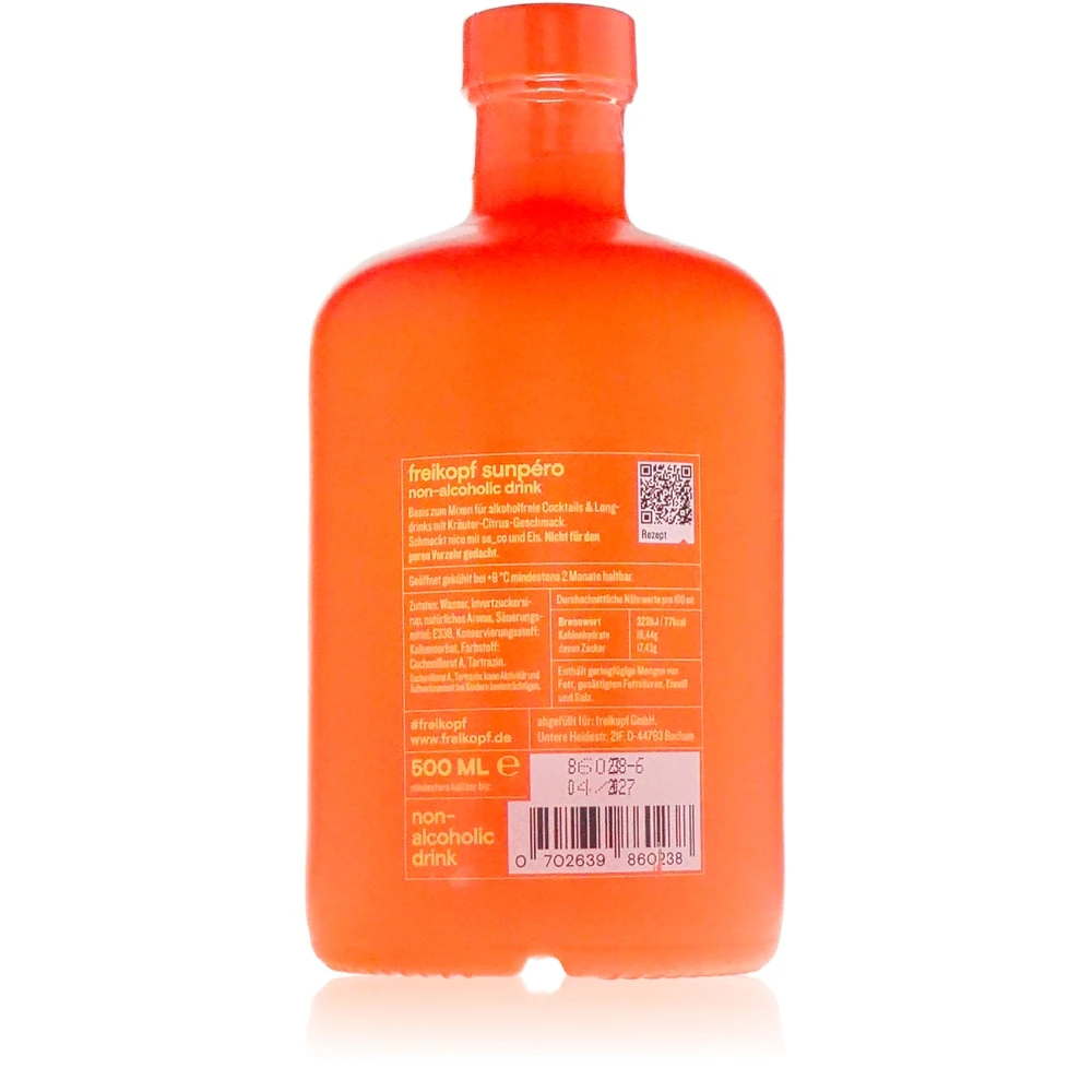 Der Freikopf Sunpero alkoholfrei gehört zur Kategorie der Bitteralternativen und wird mit größter Sorgfalt in Deutschland produziert. Freikopf hat sich über die Jahre einen Namen gemacht für qualitativ hochwertige Getränke, die Tradition und Innovation vereinen. Mit dem Sunpéro präsentiert Freikopf eine alkoholfreie Alternative, die sowohl Kenner als auch Neulinge begeistert.