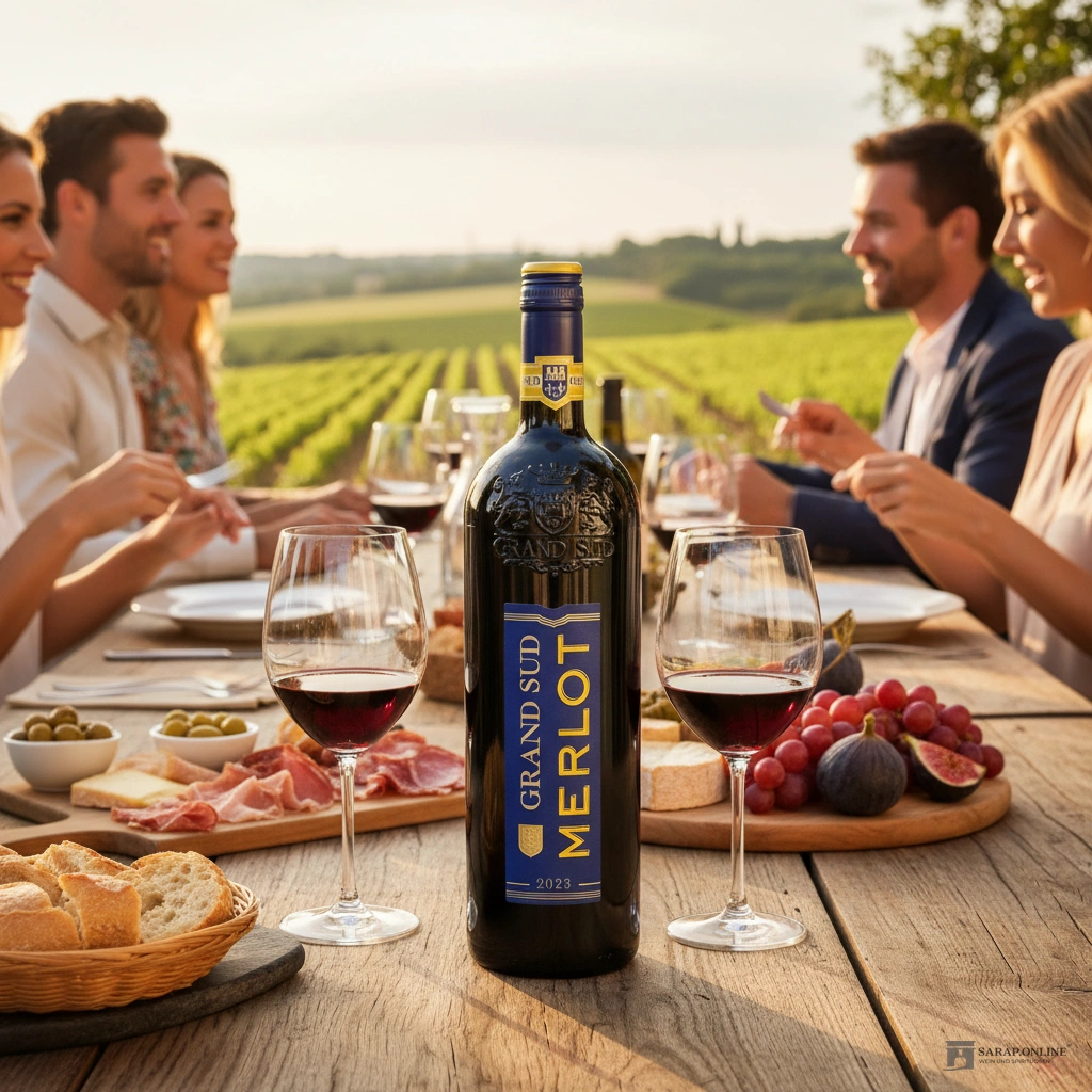 Der Wein stammt aus sorgfältig ausgewählten Weinbergen in Frankreich, wo ideale klimatische Bedingungen und fruchtbare Böden die Basis für die hochwertigen Merlot-Trauben bilden. Die Trauben werden bei optimaler Reife geerntet, um die vollen Aromen und das volle Potenzial des Weines sicherzustellen. Im Glas präsentiert sich der Grand Sud Merlot in einem tiefen Rot mit violetten Reflexen, das die Sinne anspricht.