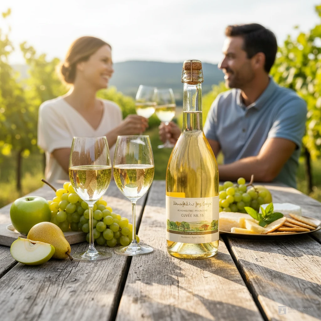 Schon beim Einschenken tanzt die feine Kohlensäure elegant im Glas und verspricht einen besonderen Moment. Im Duft entfaltet sich sofort die frische Aromatik von Apfel, begleitet von subtilen Birnen-Noten. Der erste Schluck offenbart vielschichtige Nuancen: Ein zartes Spiel zwischen Frucht und lebendiger Säure sorgt für eine angenehme Spannung am Gaumen. Im Hintergrund setzen Nussfrucht-Elemente sowie Anklänge von Kaffee gekonnte Akzente – eine Komplexität, wie man sie bei einem alkoholfreien Getränk selten erlebt.