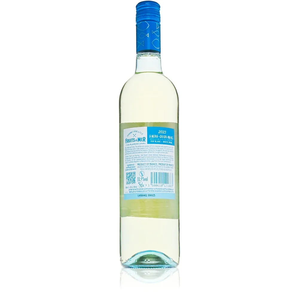 Die Weinberge rund um Bordeaux sind weltbekannt für ihre charaktervollen Tropfen. Pere & Fils Fruits de Mer knüpft an diese Tradition an und bringt das Beste aus der Region ins Glas. Die Trauben gedeihen im Zusammenspiel von Sonne, Wind und den fruchtbaren Böden des Entre deux mers – einer Herkunft mit besonderem Ruf für elegante Weißweine.