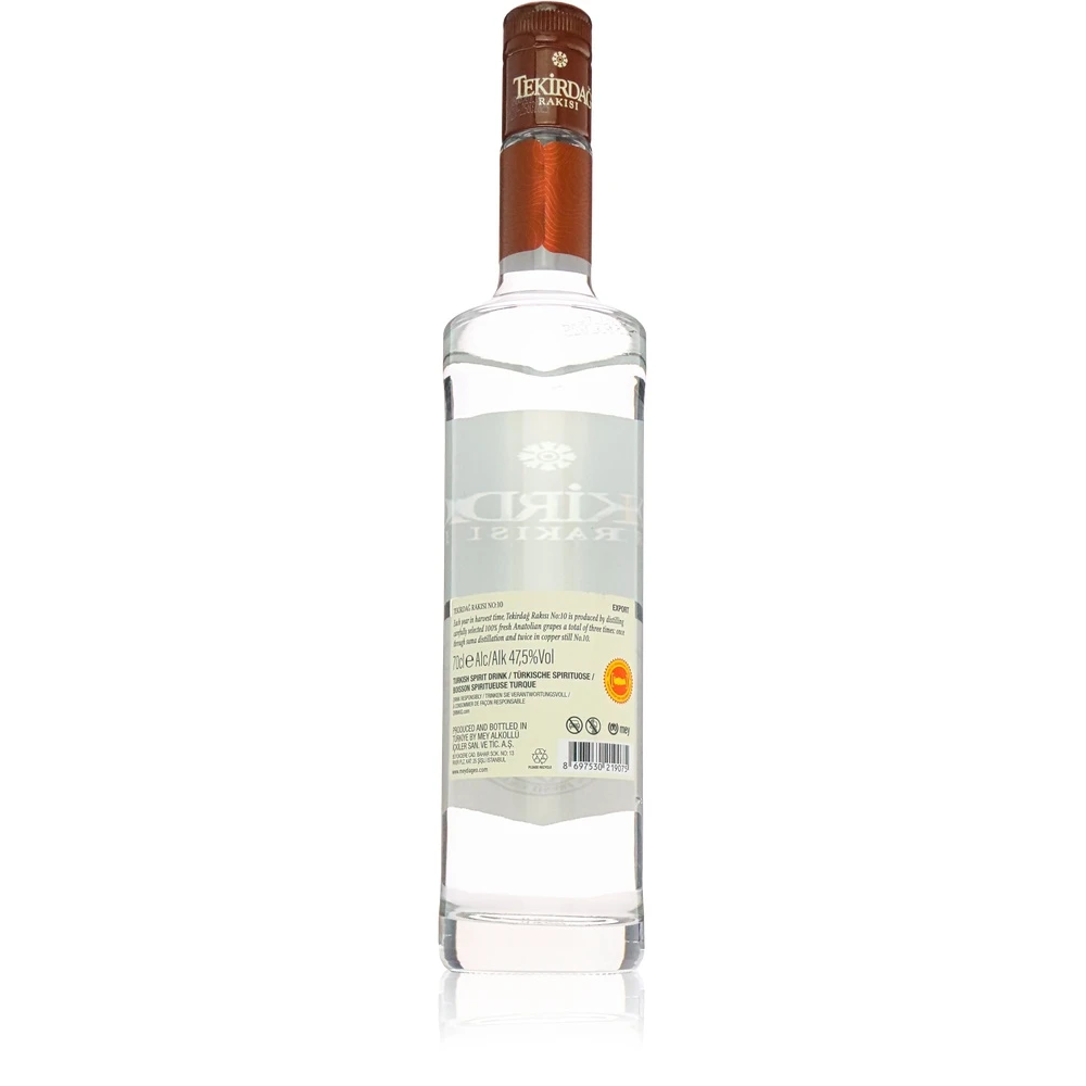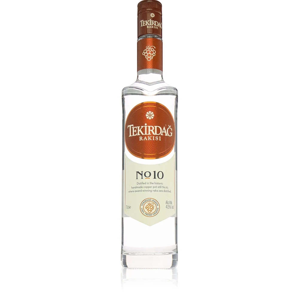 Tekirdag Raki No. 10 ist der erste Raki, der nur in einem Gefäß (3-fach) destilliert wird. Der Tekirdag Raki No 10 hat einen Alkoholgehalt von 47,5 vol. und einen Inhalt von 0,7l. Der etwas höhere Alkoholgehalt von 47,5 vol, im Gegensatz zu den normalerweise üblichen 45% in Rakis macht ihn etwas intensiver.