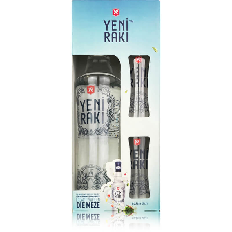 Im Set enthalten sind zwei elegante Yeni Raki Gläser, ideal geformt, um Aroma, Duft und Farbspiel optimal zur Geltung zu bringen. Ob pur, klassisch mit Wasser oder auf Eis – die Gläser sorgen für ein authentisches Raki-Erlebnis und machen das gemeinsame Genießen noch stilvoller.